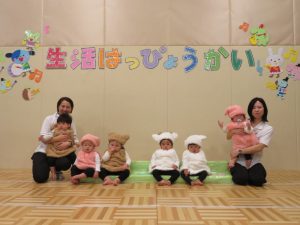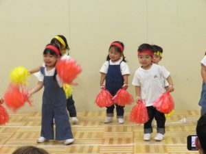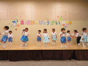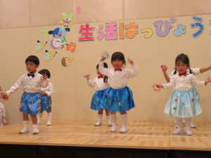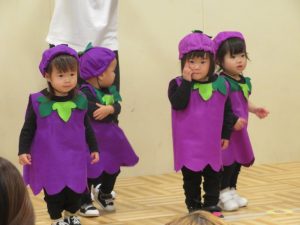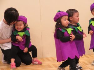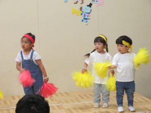可愛い衣装を着てお遊戯をしたり、普段の遊びの中で楽しんでいる手遊びやお歌、合奏などをお家の人に見ていただきました。いつもとは違った雰囲気に涙が出てしまった場面もありましたが、子どもたちそれぞれの頑張りや楽しんでいる様子が見られました。