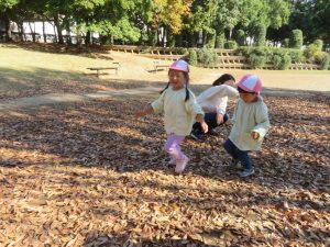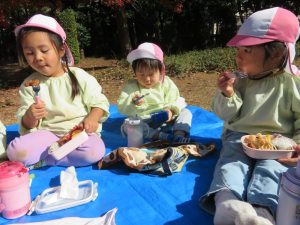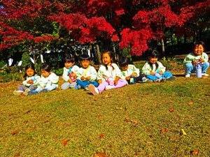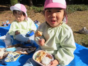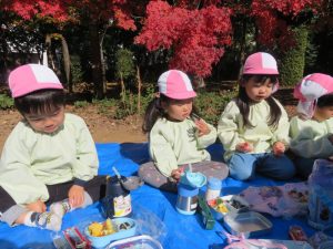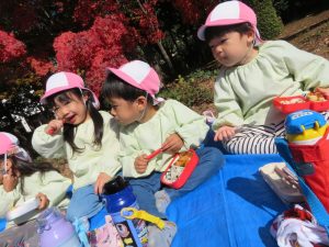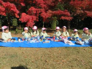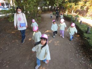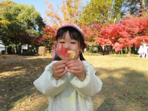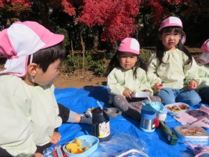 今日は松ヶ崎中央公園にお弁当と水筒を持って園外保育に行って来ました。落ち葉やどんぐりを拾ったり、お池の鯉やカルガモを見てとても楽しく過ごしました。お家の方が作ってくれたお弁当はとても美味しかったようでにニコニコ笑顔があふれました😊