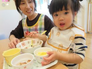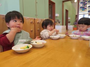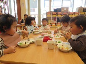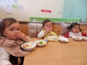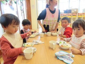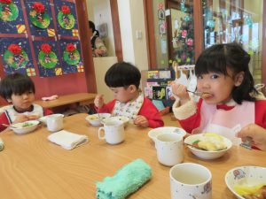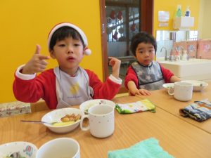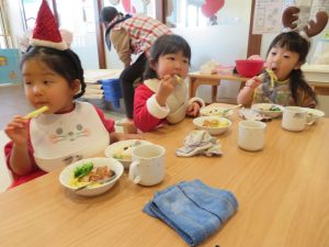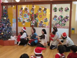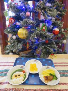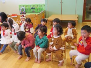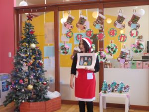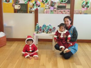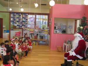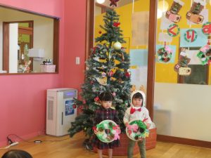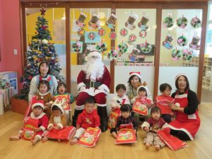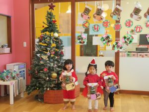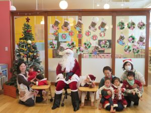 今日はクリスマス会でした。みんなで作ったクリスマス製作やツリーをお部屋に飾って、素敵な雰囲気の中で行われました。サンタさんからいただいたプレゼントが入った袋を覗き込んでいた子ども達の嬉しそうな表情がとても可愛かったです。